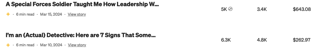 Here are two stories from this month. The top one was Boosted and made more money. Interestingly the second one wasn’t Boosted but still had more views and reads.